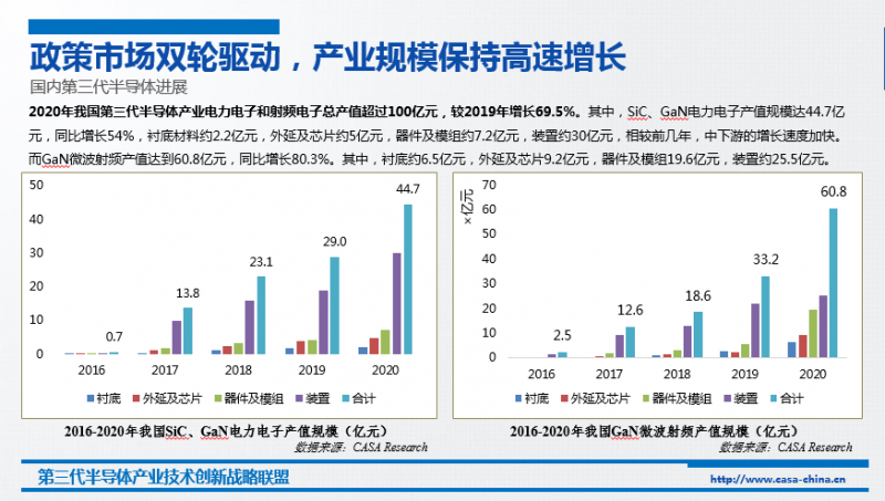 據(jù)統(tǒng)計,2020年,我國第三代半導體整體產(chǎn)值超過7100億,電力電子及微波射頻持續(xù)增長。其中,半導體照明整體產(chǎn)值預計7013億元,受新冠疫情影響較2019年下降7.1%;SiC、GaN電力電子產(chǎn)值規(guī)模達44.7億元,同比增長54%;GaN微波射頻產(chǎn)值達到60.8億元,同比增長80.3%。