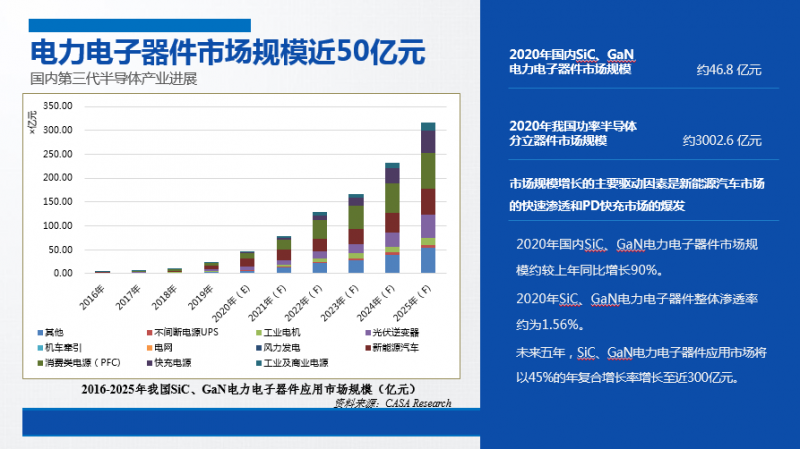 電力電子應用方面,在新能源汽車應用的強力帶動下,2020年國內(nèi)SiC、GaN電力電子器件市場規(guī)模較上年同比增長90%。同時,2020年,PD快充市場爆發(fā),國內(nèi)手機廠商和電商共推出數(shù)十款GaN快充新品,同時筆電廠商陸續(xù)進入,GaN快充將在未來幾年迎來快速發(fā)展。“十四五”科技計劃中將建設“面向大數(shù)據(jù)中心應用的GaN基高效功率電子,應用于數(shù)據(jù)中心電源的GaN電力電子器件”提上日程,未來這個市場將迎來高速增長。