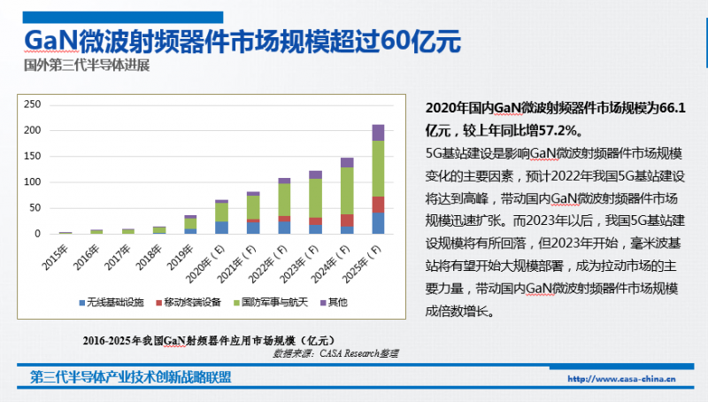 射頻應用方面,5G基站建設是關鍵驅(qū)動力量。2020年三大運營商宣布共完成80萬站5G基站建設,帶動國內(nèi)GaN微波射頻器件市場需求較上年同比增57.2%,預計2025年前我國5G宏基站預計將建設超過500萬站;2023年毫米波基站將開始部署,屆時GaN PA市場規(guī)模將有5-10倍的增長需求。