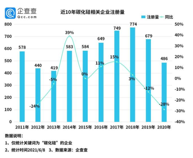 數(shù)據(jù)顯示,近10年來我國碳化硅相關(guān)企業(yè)年注冊量總體呈波動(dòng)下降趨勢,2014年增速是近10年來最高的,同比增長39%。2018年數(shù)量為歷年來最高,達(dá)774家。2019年注冊量略有下降,新增679家,同比下降12%。2020年注冊量達(dá)486家,同比下降28%。截至目前(6月8日)2021年共新增103家相關(guān)企業(yè)。