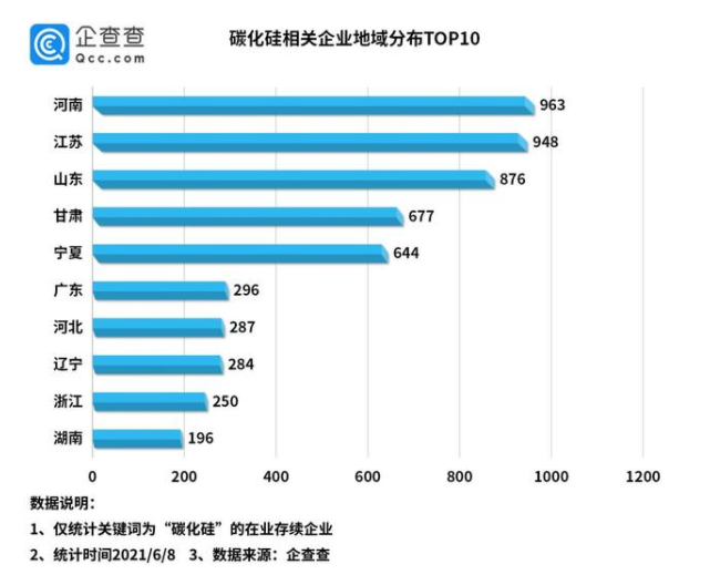 目前全國范圍內(nèi)共有7166家碳化硅相關(guān)企業(yè),其中河南省以963家相關(guān)企業(yè)排名第一,江蘇省、山東省分列二三名。