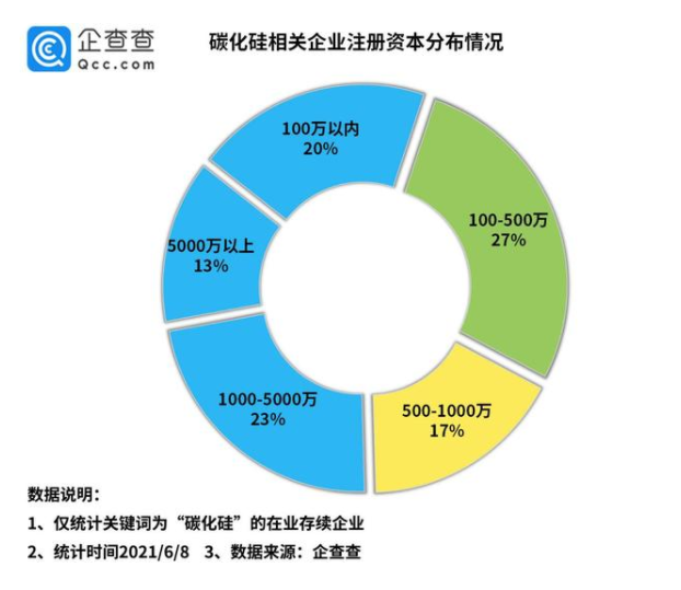 從注冊資本來看,圖表顯示,我國近5成的碳化硅相關(guān)企業(yè)注冊資本在500萬以內(nèi),其中20%注冊資本在100萬以內(nèi),另有27%的企業(yè)注冊資本在100-500萬,而注冊資本在5000萬以上的則占總量的13%。