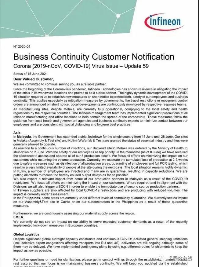 昨日全球功率半導(dǎo)體龍頭大廠英飛凌向客戶發(fā)布通知稱,受全球新冠疫情(COVID-19)再度爆發(fā)以及馬來西亞政府“全面行動管制令”的影響,英飛凌在馬來西亞的生產(chǎn)受到了較大的影響。