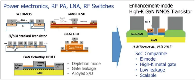 這是因為在5G通信等未來需求中,傳統(tǒng)的硅器件在高頻、高功率射頻功放方面性能不足,而GaAs HBT、GaAs HEMT和GaN HEMT又不適合用來制備高效功率電子器件,因為耗盡型GaAs HEMT和GaN HEMT是常開型器件,GaAs HBT是電流驅(qū)動,而不是場驅(qū)動。而混合使用這些器件,占用的PCB空間會比較大。