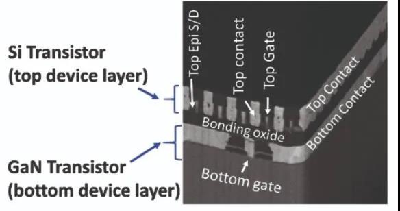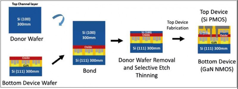 其次,英特爾運用了層轉(zhuǎn)移的方法,以單片式將12英寸的硅基PMOS晶體管堆疊在12英寸的GaN NMOS晶體管之上。