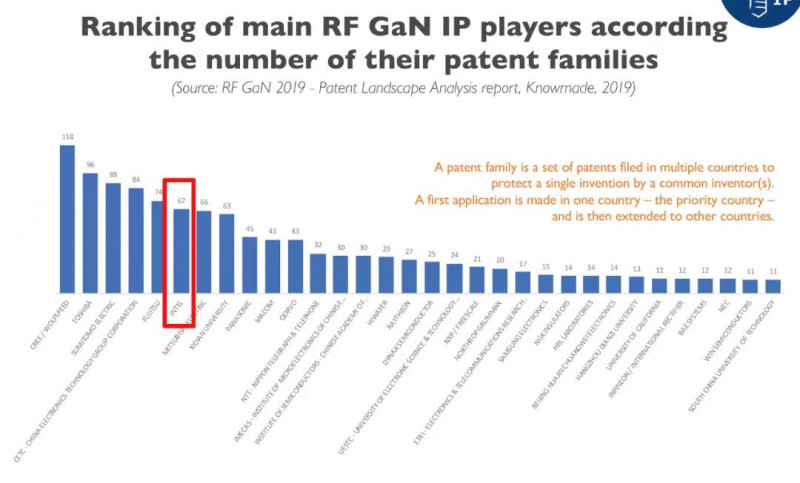 據(jù)Yole旗下KnowMade報告,英特爾、富士通和Macom在射頻硅基氮化鎵專利領(lǐng)域處于領(lǐng)先地位。