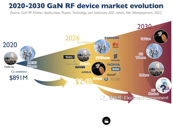 Yole在報(bào)告《2021氮化鎵射頻市場(chǎng):應(yīng)用、主要廠商、技術(shù)和襯底》中預(yù)測(cè),氮化鎵(GaN)射頻器件市場(chǎng)正以18%的復(fù)合年增長(zhǎng)率(CAGR)增長(zhǎng),從2020年的8.91億美元到2026年的24億美元以上。
