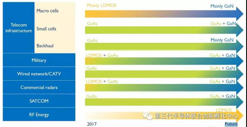 ▲不同材料體系射頻功率晶體管對(duì)比圖