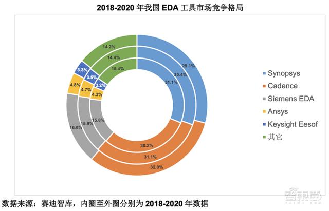 目前國際三大EDA巨頭新思科技、楷登電子和西門子EDA在國內(nèi)市場占據(jù)明顯的頭部優(yōu)勢,2020年合計占領(lǐng)約80%的市場份額,同年華大九天占有我國EDA市場約6%的份額,位居第四、本土企業(yè)第一。
