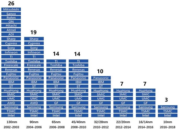 2002—2003年,采用130 nm工藝的企業(yè)有26家;2016年,采用16/14 nm工藝加工的集成電路企業(yè)銳減為7家,其中包括中國(guó)的中芯國(guó)際和華虹;到2018年,具有10 nm加工能力的企業(yè)只剩下三星、臺(tái)積電和Intel這3家。