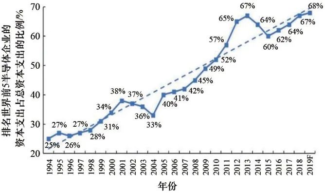 世界排名前5的半導(dǎo)體企業(yè),其資本支出之和占全部半導(dǎo)體企業(yè)資本支出的比例一直呈增長(zhǎng)趨勢(shì)。