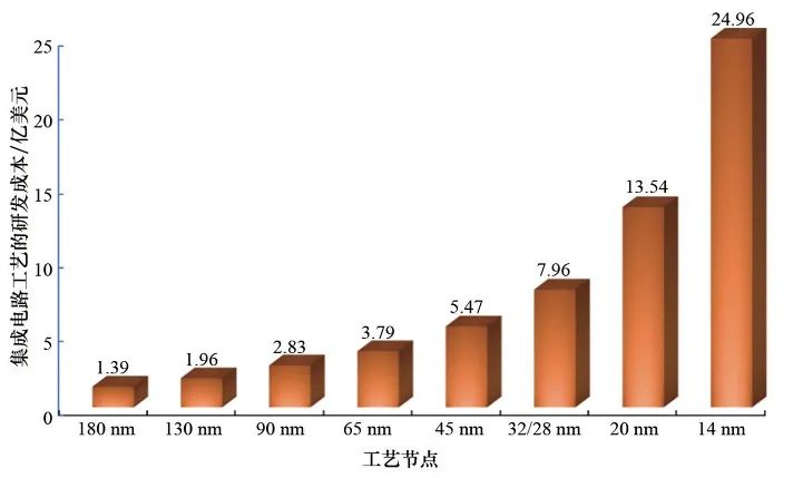 180 nm工藝的研發(fā)費(fèi)用為1.39億美元;28 nm工藝的研發(fā)費(fèi)用增長(zhǎng)5.7倍,至7.96億美元;而14 nm工藝的研發(fā)費(fèi)用進(jìn)一步上升,達(dá)到24.96億美元。