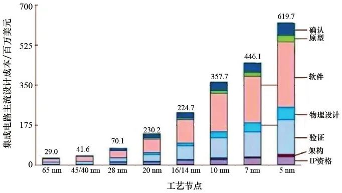 當(dāng)今,7 nm工藝的產(chǎn)品已實(shí)現(xiàn)量產(chǎn),其設(shè)計(jì)成本達(dá)到4.46億美元,其中電子設(shè)計(jì)自動(dòng)化(EDA)軟件成本約占45%,預(yù)計(jì)5 nm集成電路產(chǎn)品的設(shè)計(jì)成本約為6.2億美元,3 nm工藝GPU的設(shè)計(jì)成本將超過(guò)15億美元。