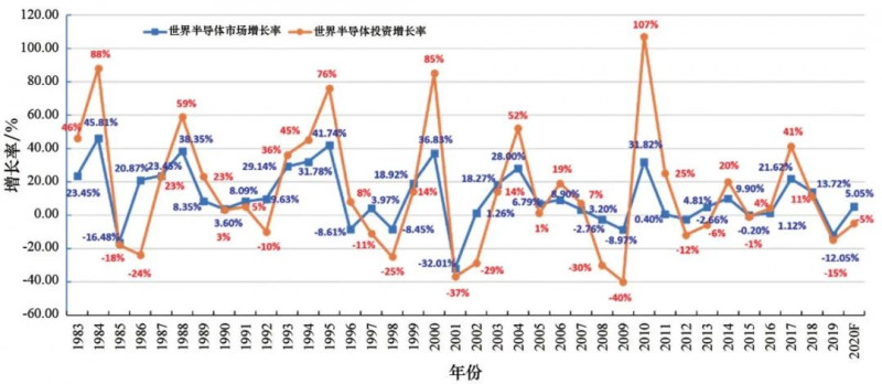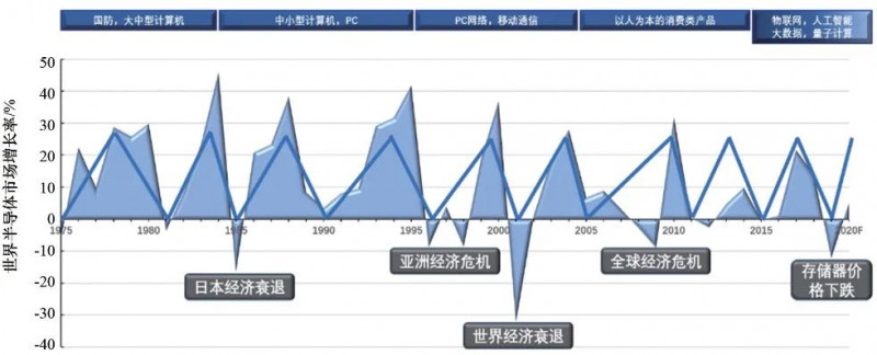 世界半導(dǎo)體市場(chǎng)增長(zhǎng)率的周期性變化 來(lái)源:WSTS