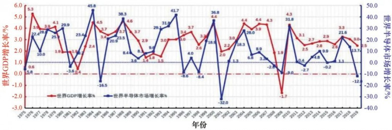 從1975—2019年世界GDP增長(zhǎng)率與世界半導(dǎo)體市場(chǎng)增長(zhǎng)率的比較可以看出,兩個(gè)增長(zhǎng)率之間存在較強(qiáng)的相關(guān)性。