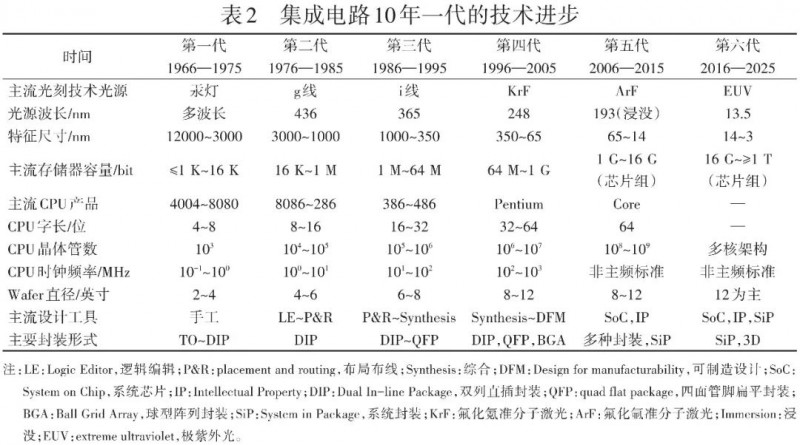 隨著主流光刻技術(shù)光源波長(zhǎng)的縮短,集成電路主流設(shè)計(jì)工具、加工特征尺寸、硅圓片直徑、主要封裝形式等技術(shù)約每10年左右取得一代明顯的進(jìn)步。