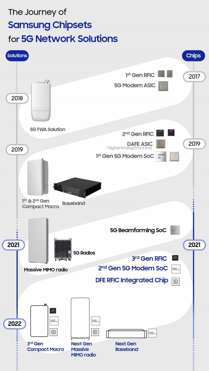 2019年,三星推出了其第一款數字/模擬前端(DAFE)芯片,作為其5G基站的重要組件(其中包括三星 5G Compact Macro),支持28GHz和39GHz頻段。