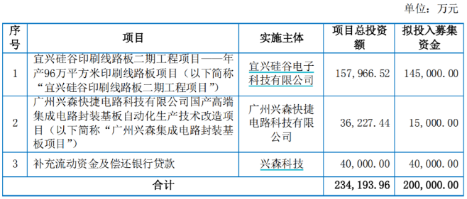 據(jù)了解,興森科技此次定增擬募資本20億元,扣除發(fā)行費(fèi)用后,計(jì)劃14.5億元用于宜興硅谷印刷線路板二期工程項(xiàng)目,1.5億元用于廣州興森集成電路封裝基板項(xiàng)目,4億元用于補(bǔ)充流動(dòng)資金及償還銀行貸款。