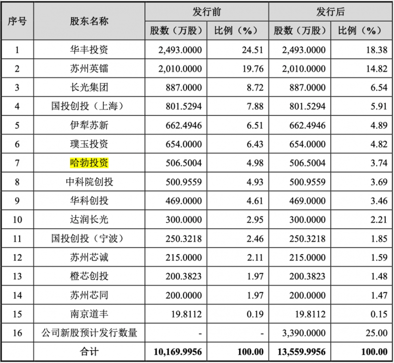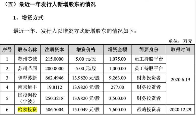 招股書(申報稿)顯示,2020年11月,長光華芯整體變更為股份有限公司,隨即在12月28日召開股東大會,同意公司向哈勃投資定向增發(fā)股份506.5004萬股,增資價格為15.0049元/股,增資金額為7600萬元。定增完成后,哈勃投資持有長光華芯4.98%股份,躋身公司前十大股東。如果按照半年前財務(wù)投資者增資價格13.982元/股計算,哈勃投資參與定增時長光華芯的估值增加7.32%。