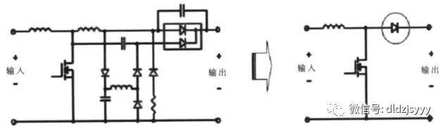 在開關(guān)電源系統(tǒng)中,二極管一般被用作整流、續(xù)流保護(hù)等。用做整流時(shí),經(jīng)常會(huì)因?yàn)檎鞫O管的反向恢復(fù)時(shí)間過長(zhǎng),進(jìn)而導(dǎo)致轉(zhuǎn)換效率降低,發(fā)熱增加。雖然使用肖特基二極管可解決反向恢復(fù)問題,但普通硅(Si)肖特基二極管的擊穿電壓很低(通常低于200V),再加上降額設(shè)計(jì),不適合高壓應(yīng)用。而用碳化硅(SiC)制作的肖特基二極管耐壓可達(dá)1200V,反向恢復(fù)電流幾乎可忽略不計(jì),因而能大大減小器件的開關(guān)損耗,同時(shí),還可簡(jiǎn)化開關(guān)電源電路中的保護(hù)電路,圖2是Cree公司提供的使用碳化硅肖特基二極管后對(duì)Boost型拓?fù)浣Y(jié)構(gòu)開關(guān)電源的簡(jiǎn)化。