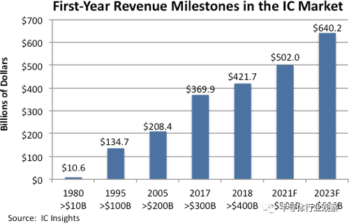 IC Insights預(yù)計(jì),今年整個(gè) IC 市場(chǎng)的強(qiáng)勁需求將使整個(gè) IC 市場(chǎng)的銷售額增長(zhǎng) 24%,并有史以來首次突破 5000 億美元的平臺(tái)(圖 1)。