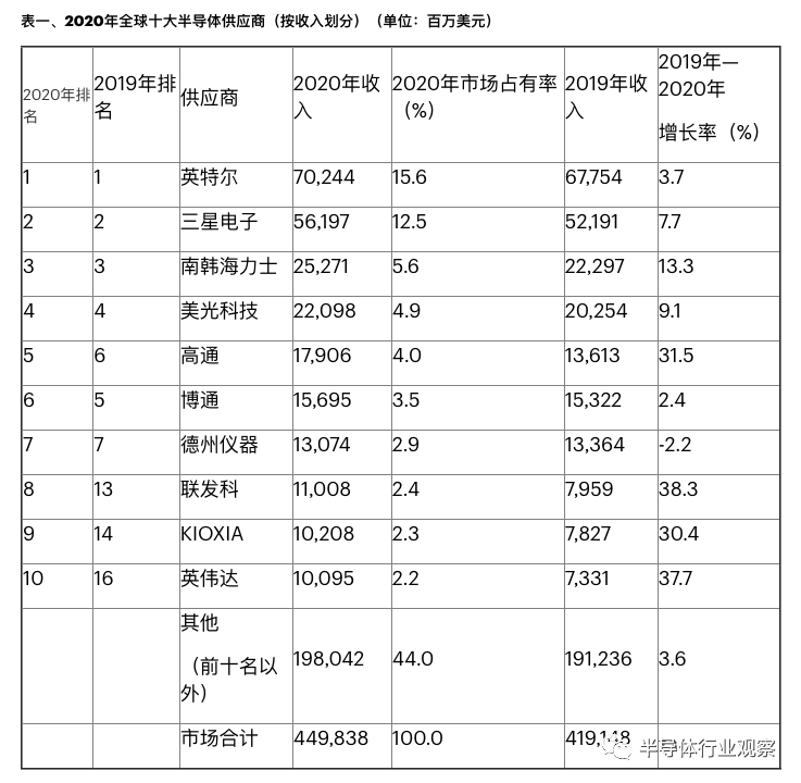 按照收入,英特爾在2020年繼續(xù)保持全球第一大半導(dǎo)體廠商的地位,其次分別是三星電子、南韓海力士和美光(見表一)。英特爾半導(dǎo)體收入增長(zhǎng)3.7%,這一增長(zhǎng)主要受核心客戶端和服務(wù)器CPU業(yè)務(wù)增長(zhǎng)的推動(dòng)。盡管智能手機(jī)市場(chǎng)整體放緩,但5G智能手機(jī)的強(qiáng)勁銷量推動(dòng)高通和聯(lián)發(fā)科等半導(dǎo)體公司在2020年實(shí)現(xiàn)強(qiáng)勁增長(zhǎng)。5G的增長(zhǎng)抵消了系統(tǒng)單元增長(zhǎng)的疲軟,同時(shí)半導(dǎo)體的美元價(jià)值增加,包括美國(guó)銷售價(jià)格(ASP)更高的5G芯片組與附加射頻前端組件和電源管理集成電路。