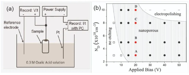 圖1.(a)電化學蝕刻工藝產生納米多孔GaN。(b)GaN電化學蝕刻工藝的相圖