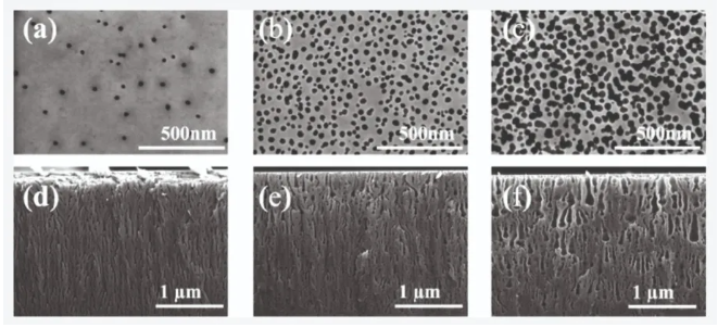 圖2.(a-c)具有不同孔隙率的納米多孔GaN在不同的偏置電壓下蝕刻的俯視圖和(d-f)截面掃描電子顯微鏡圖像。經美國化學學會許可轉載。