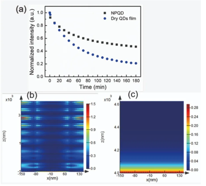 圖4.(a)GaN藍寶石晶片上的紅色納米多孔量子點樣品和量子點薄膜的紅色發(fā)射的歸一化功率強度的比較。兩種樣品均用420 nm藍色激光激發(fā)3小時。(b)納米多孔GaN吸收藍光的模擬映射結果。(c)納米多孔膜吸收藍光的模擬映射結果。