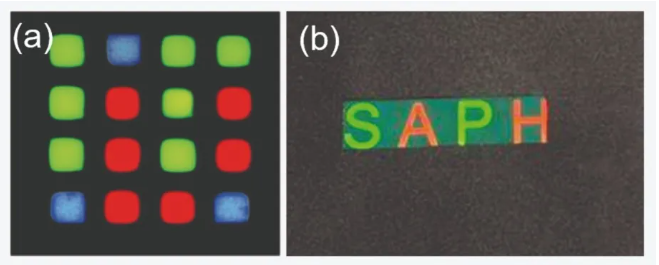 圖6.(a)Saphlux RGB單片微型LED由背面的藍色LED光源激發(fā)。(b)由紅色和綠色納米多孔量子點microLED制成的公司徽標“ SAPHLUX”的圖片。
