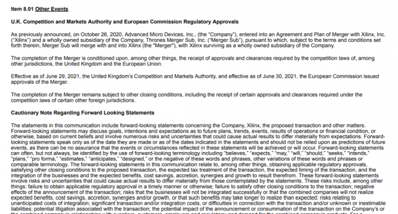 當(dāng)?shù)貢r(shí)間6月29日,AMD發(fā)布公告表示, 350億美元收購賽靈思的計(jì)劃獲得歐盟監(jiān)管機(jī)構(gòu)無條件批準(zhǔn)。英國競爭和市場管理局于6月29日批準(zhǔn)了該筆交易。