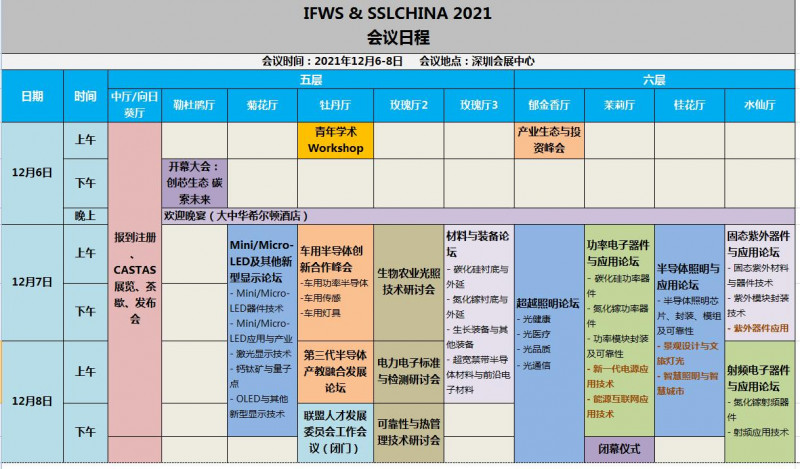 *IFWS相關(guān)會(huì)議包含:開幕大會(huì),功率電子器件與應(yīng)用論壇、射頻電子器件與應(yīng)用論壇,材料與裝備論壇、固態(tài)紫外器件與應(yīng)用論壇,車用半導(dǎo)體峰會(huì)、產(chǎn)業(yè)生態(tài)與投資峰會(huì)、閉幕大會(huì)。