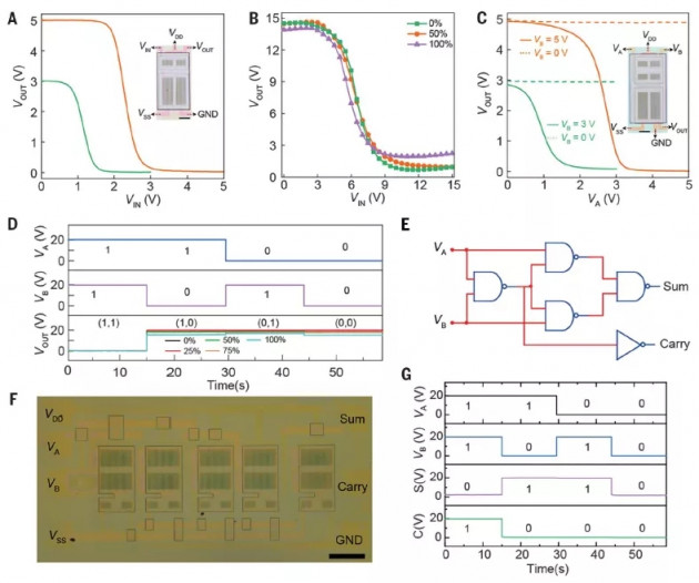 最后,研究人員制備了逆變器和與非門。彈性逆變器的溝道長(zhǎng)度僅為10μm,比前文報(bào)導(dǎo)的空間分辨率高出一個(gè)數(shù)量級(jí)。在邏輯輸入狀態(tài)為0和1的情況下,100%應(yīng)變下的逆變器也能夠正常工作(圖5B)。更復(fù)雜的邏輯電路異或門(24個(gè)晶體管集成)和半加法器(30個(gè)晶體管集成)的正常工作表明所有單元器件的均勻性和高成品率。