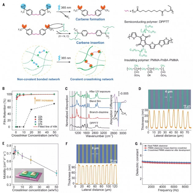 研究人員使用了一種高效的光引發(fā)卡賓插入反應(yīng)作為半導(dǎo)體聚合物和絕緣聚合物的通用交聯(lián)方法(圖1E)。還引入了對(duì)紫外光敏感的聚乙二醇二醇丙烯酸酯(PEGDMA),實(shí)現(xiàn)了導(dǎo)電聚合物的雙網(wǎng)絡(luò)介導(dǎo)直接光刻(無(wú)化學(xué)改性)。設(shè)備可以通過四個(gè)直接光刻步驟制造,無(wú)需額外的保護(hù)、蝕刻、轉(zhuǎn)移或?qū)訅汗に嚕▓D1F)。基于交聯(lián)的圖案化策略使每一層都能穩(wěn)定固定并具有化學(xué)耐腐蝕性,允許了晶圓規(guī)模的逐層沉積。