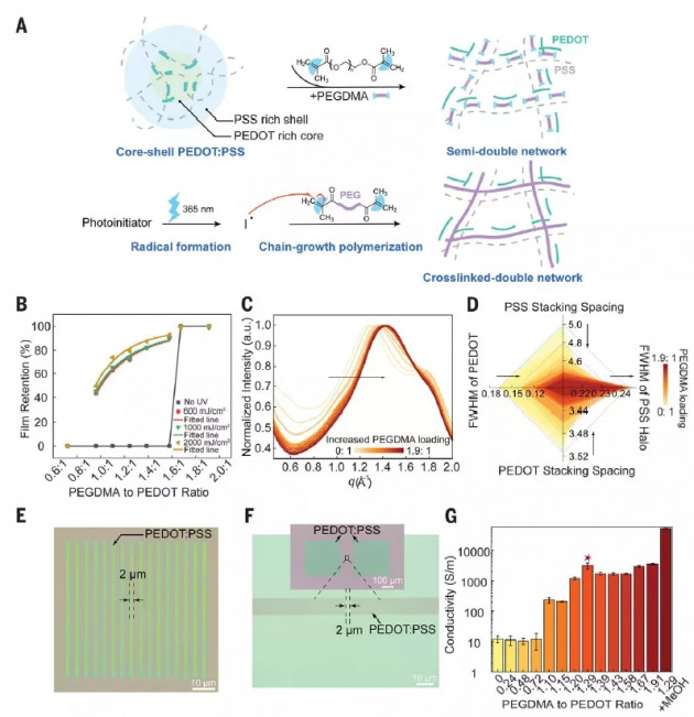 PEDOT:PSS的溶解度可以通過將物理交聯(lián)導(dǎo)電網(wǎng)絡(luò)嵌入共價(jià)交聯(lián)PEGDMA網(wǎng)絡(luò)來(lái)實(shí)現(xiàn)。PEDOT與PEG連接劑之間的強(qiáng)相互作用導(dǎo)致PEDOT:PSS的微觀結(jié)構(gòu)從核殼結(jié)構(gòu)轉(zhuǎn)變?yōu)楦L(zhǎng)的鏈,從而形成了第一個(gè)導(dǎo)電網(wǎng)絡(luò)(圖2A)。在紫外光(365 nm)引發(fā)后,丙烯酸二甲酯(DMA)修飾的聚乙二醇經(jīng)過快速自由基聚合形成第二個(gè)網(wǎng)絡(luò)。兩個(gè)網(wǎng)絡(luò)之間強(qiáng)烈的分子間相互作用使暴露于紫外線的區(qū)域能夠抵抗水,而未暴露的區(qū)域仍然是水溶性的。這種光圖案化能力與PEGDMA/PEDOT的配比極為相關(guān),PEGDMA不足會(huì)導(dǎo)致薄膜耐腐蝕性差,而過多則會(huì)導(dǎo)致紫外線曝光前就形成交聯(lián)(圖2A,B)。隨著PEG連接劑的增加,PEDOT分子間的鏈間偶聯(lián)更強(qiáng),PEDOT π-π堆積距離逐漸減小,形成更大的晶粒(圖2C,D)。通過調(diào)整合適的配比(1.15:1 PEGDMA/PEDOT),實(shí)現(xiàn)了分辨率2 μm的圖案化(圖2E,F(xiàn))。此外,PEGDMA的加入也大大提高了PEDOT:PSS的電導(dǎo)率。