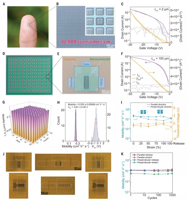 研究人員在0.238 cm2的基底上制作了一個(gè)包含10,000個(gè)晶體管的全聚合物彈性晶體管陣列(圖4A,B),器件密度高達(dá)42000個(gè)晶體管/每平方厘米,是前期采用掩膜蝕刻工藝制備陣列密度的100倍以上。器件溝道長(zhǎng)度2μm,寬40μm。開關(guān)比為104,且off態(tài)電流低至0.5 nA(圖4C)。隨后制備了10×10的晶體管陣列,每個(gè)單元器件都表現(xiàn)出典型的P型轉(zhuǎn)移曲線,平均飽和遷移率為0.255 m2 V–1 s–1(圖4F)。器件產(chǎn)率為98.5%,標(biāo)準(zhǔn)偏差僅為3.76%(圖4G)。閾值電壓(Vth)的分布為0.61±0.45 V(圖4H),僅為工作柵源電壓窗口(30 V)的1.5%。在平行和垂直于電荷傳輸方向的100%應(yīng)變下,晶體管陣列沒有任何可見的裂縫或分層(圖4J),證實(shí)每層的力學(xué)性能優(yōu)異。其電學(xué)性能在沿電荷輸運(yùn)方向、100%應(yīng)變下也能夠保持穩(wěn)定,遷移率保持在原始值的88%,閾值電壓接近0v(圖4I)。在垂直方向拉伸下,遷移率略有下降。在兩個(gè)方向50%應(yīng)變下,可以承受1000次的重復(fù)拉伸,電學(xué)性能無(wú)明顯變化(圖4K)。