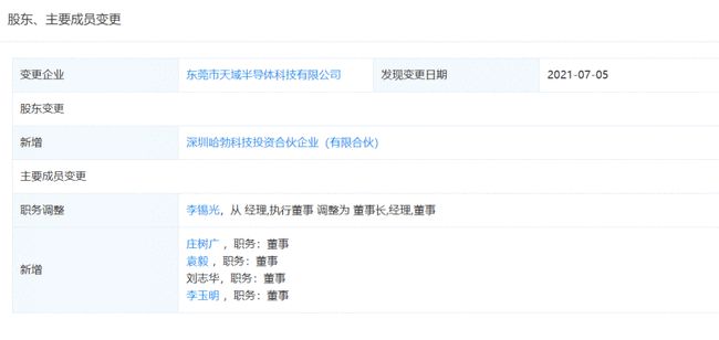 近日,東莞市天域半導(dǎo)體科技有限公司(以下簡稱“天域半導(dǎo)體”)工商信息發(fā)生變更,其中,注冊資本從9027.0589萬元增至9770.4638萬元,同時新增深圳哈勃科技投資合伙企業(yè)(有限合伙)(以下簡稱“深圳哈勃”)為股東。