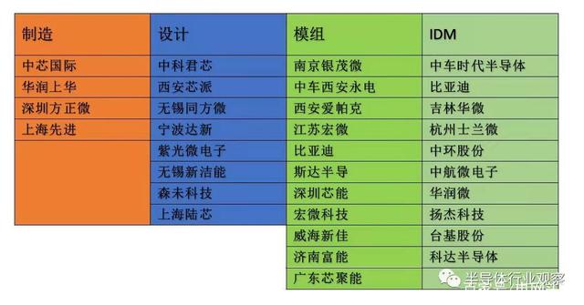 相比之下,國內(nèi)企業(yè)與英飛凌等國外企業(yè)在設(shè)計能力和工藝制程上的差距很明顯。 國內(nèi)的IGBT芯片企業(yè)主要分為兩類:一類是IDM(垂直整合制造)公司,如比亞迪半導(dǎo)體、中車時代、士蘭微、華潤微、華微電子等,它們從芯片設(shè)計到晶圓制造,再到器件和模組都會做。另一類是Fabless(無晶圓IC)公司,如斯達半導(dǎo)體、上海陸芯、中科君芯、森未科技、深圳芯能等公司,它們只做芯片計,晶圓制造在華虹宏力、上海先進半導(dǎo)體、中芯國際等芯片制造廠代工生產(chǎn)。