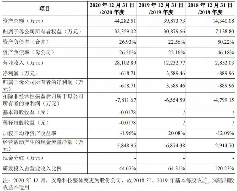 財務(wù)數(shù)據(jù)方面,2018-2020年度,安路科技的營業(yè)收入分別為2852.03萬元、1.22億元、2.81億元,逐年走高且增長迅猛,年均復(fù)合增長率高達(dá)213.91%。同期的歸母凈利潤分別為-889.96萬元、3589.46萬元、-618.71萬元。報告期各期末,公司總資產(chǎn)分別為 14,340.08 萬元、39,873.73 萬元、44,282.51 萬元,2018-2020年度末總資產(chǎn)年均復(fù)合增長率達(dá)75.73%。報告期各期,公司綜合毛利率分別為 30.09%、34.42%、34.18%,呈逐步上升的趨勢。