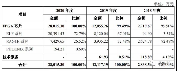 從營收構(gòu)成來看,安路科技的營收主要來自于FPGA芯片的銷售,其中以低功耗的ELF系列的FPGA芯片所貢獻(xiàn)的營收占比呈現(xiàn)快速提升的趨勢,2018年度占比僅3.34%,到2020年占比已提升至72.79%。技術(shù)服務(wù)的占比極小,接呈現(xiàn)逐年下滑的趨勢。
