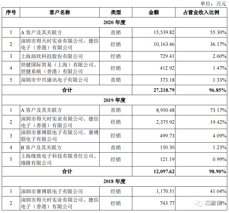 在報告期各期,公司前五大客戶的銷售金額合計占營業(yè)收入比例分別為 83.15%、98.90%和 96.85%,客戶集中度較高。