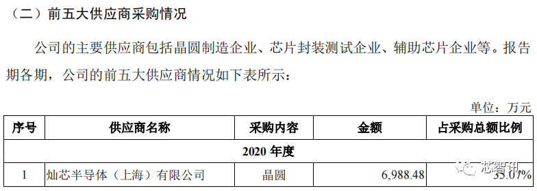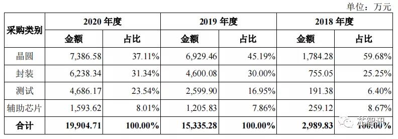 可以看到,在總體的采購金額當(dāng)中,晶圓、封測及測試的占比較高,2020年度分別為37.11%、31.34%、23.54%,輔助芯片占比較小,僅有8.01%。