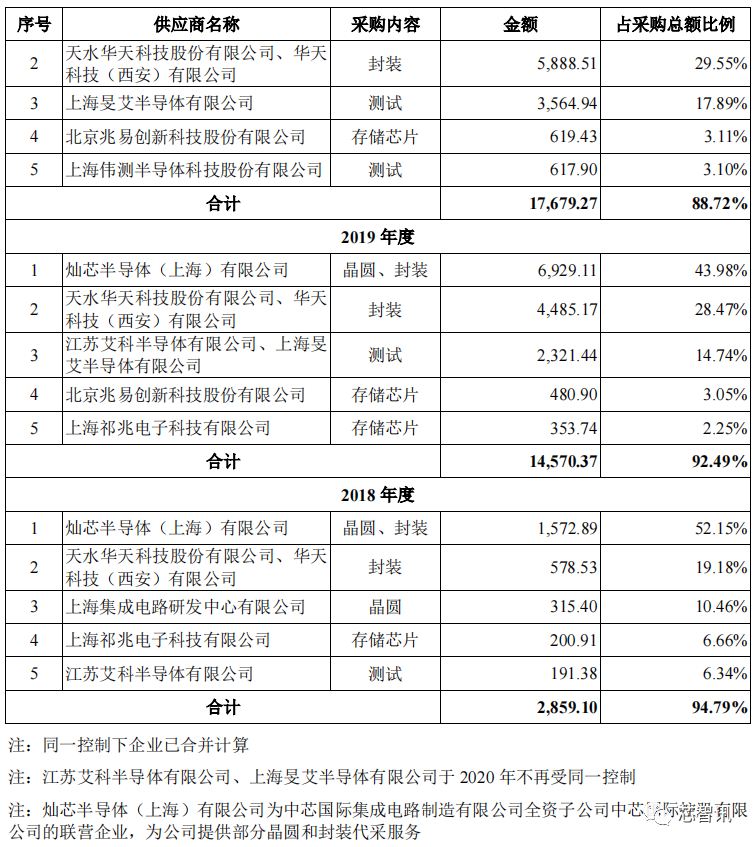 具體來看,2019 年,公司新增北京兆易創(chuàng)新科技股份有限公司為前五大供應(yīng)商,主要系公司合封存儲芯片的型號產(chǎn)量提高所致。2020 年,公司新增上海偉測半導(dǎo)體科技股份有限公司,主要系公司為保持測試采購的穩(wěn)定性,采取多元化采購策略所致。2019 年,公司減少上海集成電路研發(fā)中心有限公司為前五大供應(yīng)商,主要系公司晶圓采購策略有所改變,改為向燦芯半導(dǎo)體(上海)有限公司等采購所致。2020 年,公司減少祁兆電子為前五大供應(yīng)商,主要系公司存儲芯片采購策略有所改變,公司雖與祁兆電子合作穩(wěn)定,但新增存儲芯片主要向兆易創(chuàng)新等供應(yīng)商采購所致。