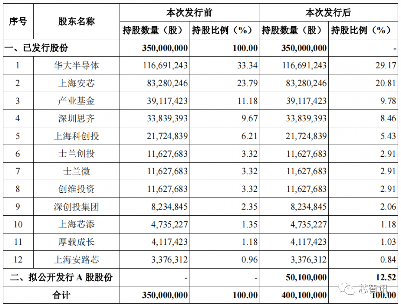 截至本招股說明書簽署日,公司前六大股東分別為:華大半導(dǎo)體持股33.34%、上海安芯及其一致行動人(上海安路芯與上海芯添)持股26.10%、產(chǎn)業(yè)基金持股26.10%、深圳思齊持股11.18%、控股股東同為杭州士蘭控股有限公司的士蘭微與士蘭創(chuàng)投合計持股6.64%、上??苿?chuàng)投6.21%。