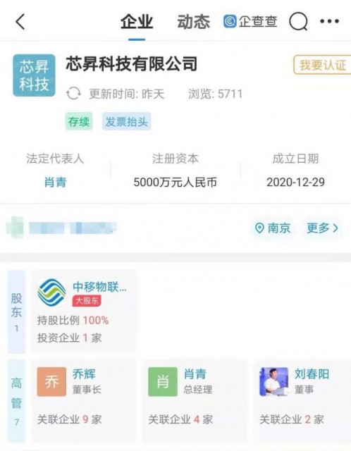 企查查APP顯示,該公司成立于2020年,法定代表人為肖青,注冊資本5000萬元,經(jīng)營范圍包含智能車載設(shè)備制造;智能車載設(shè)備銷售;電子元器件制造等。企查查股權(quán)穿透顯示,目前該公司由中移物聯(lián)網(wǎng)有限公司100%控股。