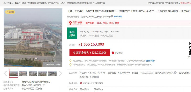 半導體產(chǎn)業(yè)網(wǎng)消息:目前,德淮半導體有限公司整體資產(chǎn)拍賣項目正在京東拍賣網(wǎng)拍賣,包含德淮全部動產(chǎn)和不動產(chǎn),但不含芯片成品和芯片原材料。目前已超7600人圍觀,但尚無人報名競拍。