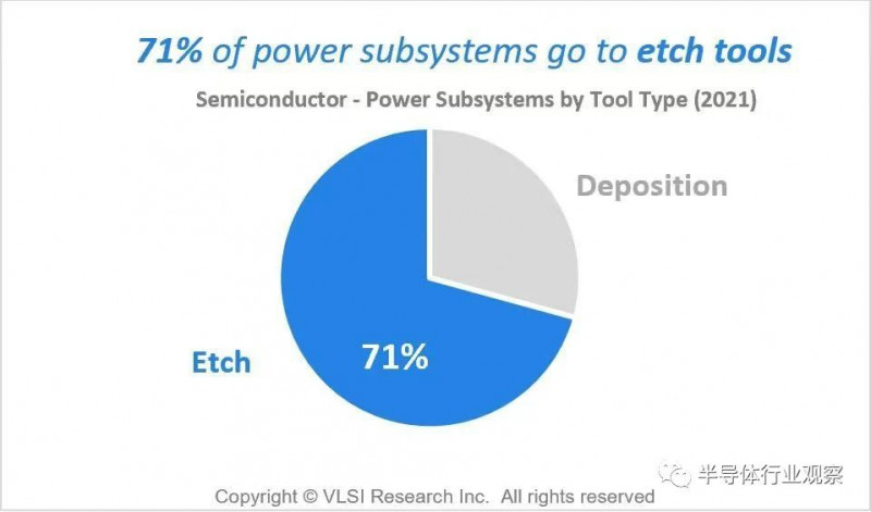有趣的是,按工具類型對(duì)電源子系統(tǒng)的分析表明,絕大多數(shù)電源子系統(tǒng) (70%) 用于蝕刻工具,只有 30% 用于沉積工具。這種差異可以通過以下事實(shí)來解釋:更精細(xì)的蝕刻工藝可能需要每個(gè)工具使用多個(gè) RF 功率解決方案。相比之下,沉積并不總是使用等離子體能源,例如,在熱沉積工藝中。