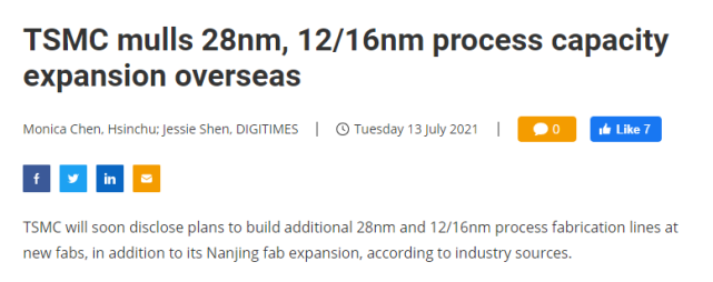 7月13日,DIGITIMES援引業(yè)內人士消息稱,臺積電將很快披露在南京廠擴建的基礎上,在新工廠增建28nm和12/16nm工藝產線的計劃。