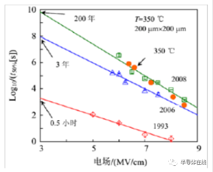 隨著碳化硅 MOSFET 技術(shù)的進(jìn)步,高性能的碳化硅 MOSFET也被研發(fā)出來,已有研究結(jié)果報道了具有較大的電壓電流能力的碳化硅MOSFET器件。三菱公司報道的1.2kV碳化硅 MOSFET器件的導(dǎo)通比電阻為 5mΩ·cm 2,比硅基的 CoolMOS的性能指數(shù)好 15~20倍。美國 Cree公司報道了 8.1mm×8.1mm、阻斷電壓 10 kV、電流 20 A的碳化硅 MOSFET芯片,其正向阻斷特性如圖 2所示。通過并聯(lián)這樣的芯片得到的模塊可以具備 100 A的電流傳輸能力 [3] 。該器件在 20 V的柵壓下的通態(tài)比電阻為127 mΩ·cm2,同時具有較好的高溫特性,在 200 ℃條件下,零柵壓時可以實(shí)現(xiàn)阻斷10 kV電壓。在碳化硅 MOSFET 的可靠性研究方面,有研究報道了在350 ℃下碳化硅柵氧層具有良好的可靠性 [8] 。如圖 3所示, 20 年以來碳化硅 MOSFET 柵氧層的可靠性得到明顯提高。這些研究結(jié)果表明,柵氧層將有望不再是碳化硅MOSFET 的一個瓶頸。
