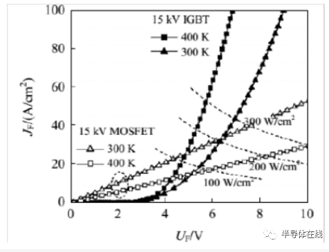 在高壓領(lǐng)域,碳化硅 IGBT器件將具有明顯的優(yōu)勢。由于受到工藝技術(shù)的制約,碳化硅 IGBT的起步較晚,高壓碳化硅 IGBT面臨兩個挑戰(zhàn):第一個挑戰(zhàn)與碳化硅MOSFET器件相同,溝道缺陷導(dǎo)致的可靠性以及低電子遷移率問題;第二個挑戰(zhàn)是N型IGBT需要P型襯底,而 P 型襯底的電阻率比 N 型襯底的電阻率高 50倍。因此,1999 年制成的第一個 IGBT 采用了 P 型襯底。經(jīng)過多年的研發(fā), 逐步克服了 P 型襯底的電阻問題, 2008 年報道了 13 kV的N溝道碳化硅 IGBT器件,比導(dǎo)通電阻達(dá)到22mΩ·cm 2[3] 。圖4對15kV的N-IGBT和MOSFET 的正向?qū)芰ψ隽艘粋€比較 [4] ,結(jié)果顯示,在結(jié)溫為 300 K時,在芯片功耗密度為 200 W/cm2 以下的條件下,MOSFET可以獲得更大的電流密度, 而在更高的功耗密度條件下, IGBT可以獲得更大的電流密度。但是在結(jié)溫為 127℃時, IGBT在功耗密度為 50 W/cm2以上的條件下就能夠?qū)ū?MOSFET更高的電流密度。同一年,該團(tuán)隊還報道了阻斷電壓達(dá)到12kV的P溝道碳化硅 IGBT,導(dǎo)通比電阻達(dá)到 14mΩ·cm 2[8] 。新型高溫高壓碳化硅IGBT器件將對大功率應(yīng)用, 特別是電力系統(tǒng)的應(yīng)用產(chǎn)生重大的影響。在15kV以上的應(yīng)用領(lǐng)域,碳化硅 IGBT綜合了功耗低和開關(guān)速度快的特點(diǎn), 相對于碳化硅的 MOSFET以及硅基的 IGBT、晶閘管等器件具有顯著的技術(shù)優(yōu)勢, 特別適用于高壓電力系統(tǒng)應(yīng)用領(lǐng)域。